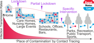 The Luxembourg Mnistry of Health through its ‘contact tracing teams’ found on average over 25% of weekly new-infections detected are transmitted within the household, which seems very likely as the ‘associations/ contact’ within a household are strong (spend longer times together) and highly connected (meaning all members share the same space). A similar scenario can … Continue reading Anatomy of Current Pandemic Infection Transmission and Interventions